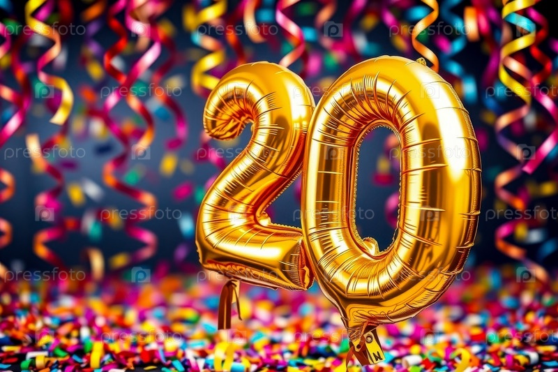 Гелиевый баллон на день рождения в форме числа двадцать, фигура золотой буквы 20 на фоне праздничного торжества