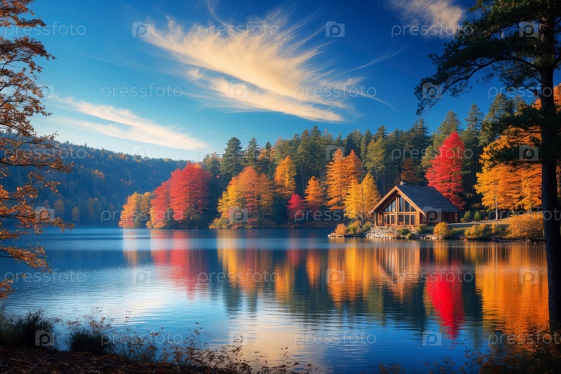 Дом здания ландшафтный фон красные и желтые листья осень-осень осенний лесной парк AI Generative