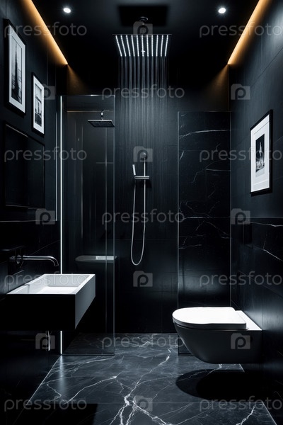 AI Generative Апартамент ванная комната интерьер черный цвет, темные туалеты дизайн раковины, ванна, унитаз и зеркало