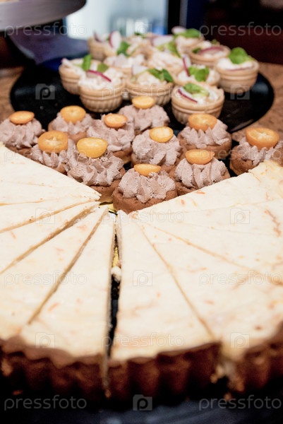 Буфетный гостиничный ресторан, кафе-брейк событие еда на деревянных тарелках стоит за столом