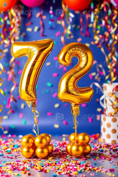 Гелий день рождения воздушный шар номер семьдесят два, фигура золотых букв 72 праздник праздничный фон