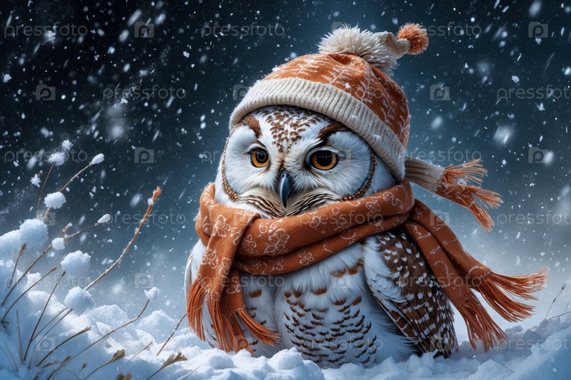 Портрет совы в вязанной зимней одежде, шляпе и шарфе, животное во снежных дождях зимой AI Generative