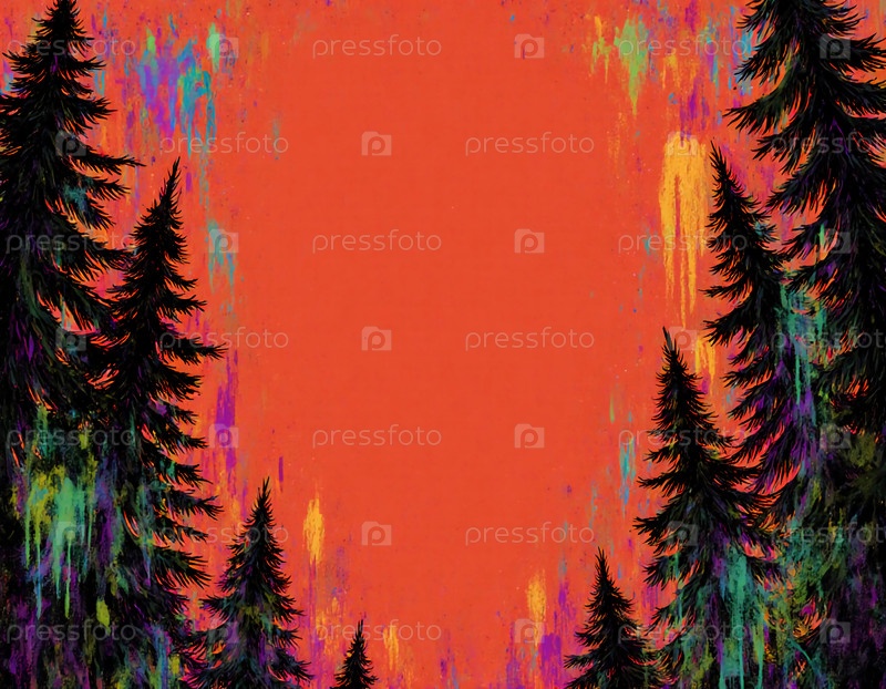 Деревья ель высоко стоят на ярко-оранжевом фоне с намеками различных цветов вокруг краев в теплое время суток Generative AI