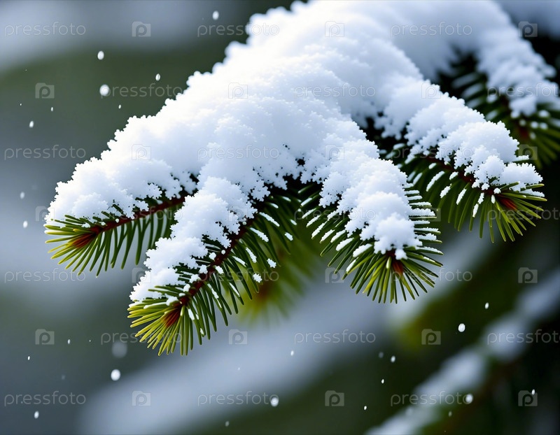 Снег собирается на зеленых ветвях сосны, а снежинки падают в лесу.Сцена показывает типичный зимний день с холодной погодой и снегом Генеративный ИИ