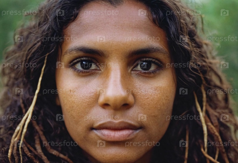 Молодая австралийская аборигенка уверенно стоит, ее волосы украшены естественными акцентами