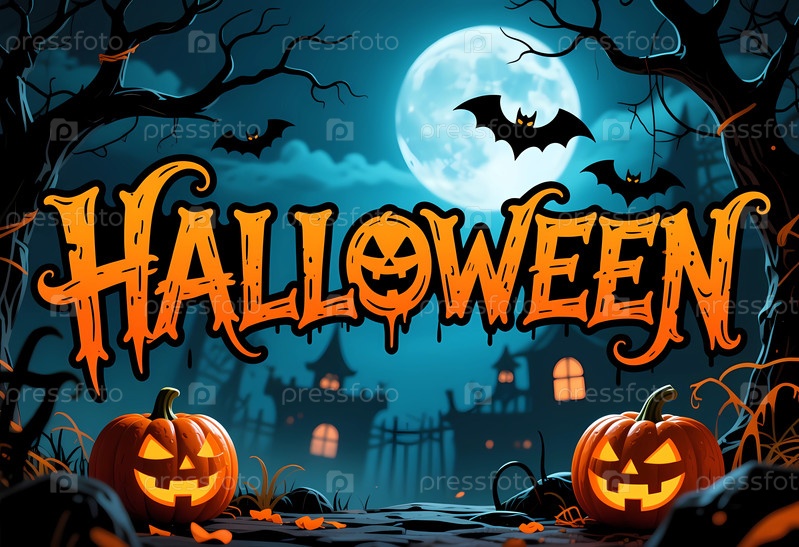 Ужасная сцена Хэллоуина включает в себя светящиеся фонарики, окруженные летучими мышами, летающими перед полнолунием