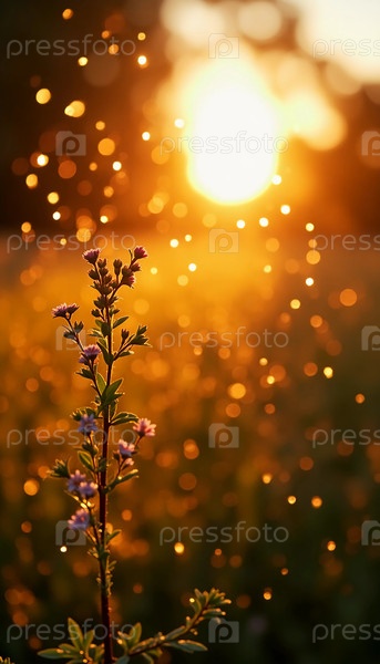 Солнечный свет купает яркий цветок в тихом поле, создавая волшебную атмосферу с мерцающими частицами пыли, плавающими нежно в теплом воздухе на закате