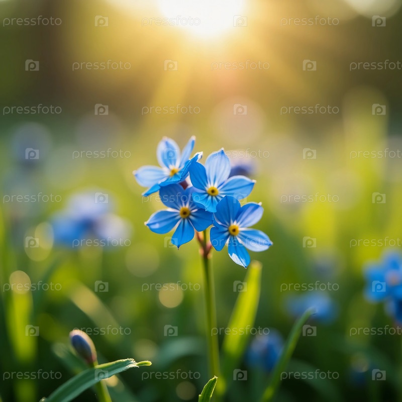 Вибрирующие голубые цветы стоят высоко на солнечном лугу, их нежные лепестки ловят свет.Сцена оживлена зеленью и обещает радость теплого весеннего дня