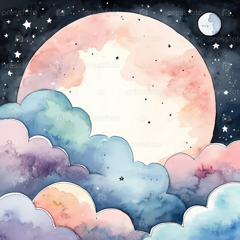 Очаровательное акварельное ночное небо с луной и звездами над мечтательными облаками на спокойном космическом фоне для художественного вдохновения Генеративный ИИ
