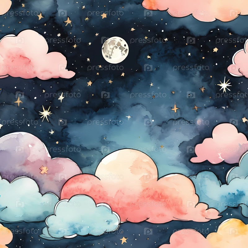 Увлекательный акварельный рисунок изображает звездное ночное небо, украшенное яркой луной и мягкими пастельными облаками