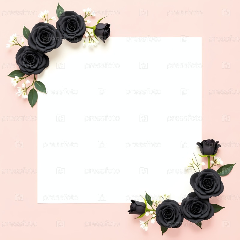 Черные розы грациозно переплетаются вокруг пустого квадрата на мягком розовом фоне, создавая мечтательную и элегантную обстановку, идеально подходящую для художественного выражения или приглашений Generative AI