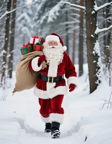 Санта-Клаус гуляет по снежному лесу, неся большую сумку, наполненную подарками.Его окружают деревья, когда он прокладывает свой путь через белый пейзаж во время зимы Generative AI