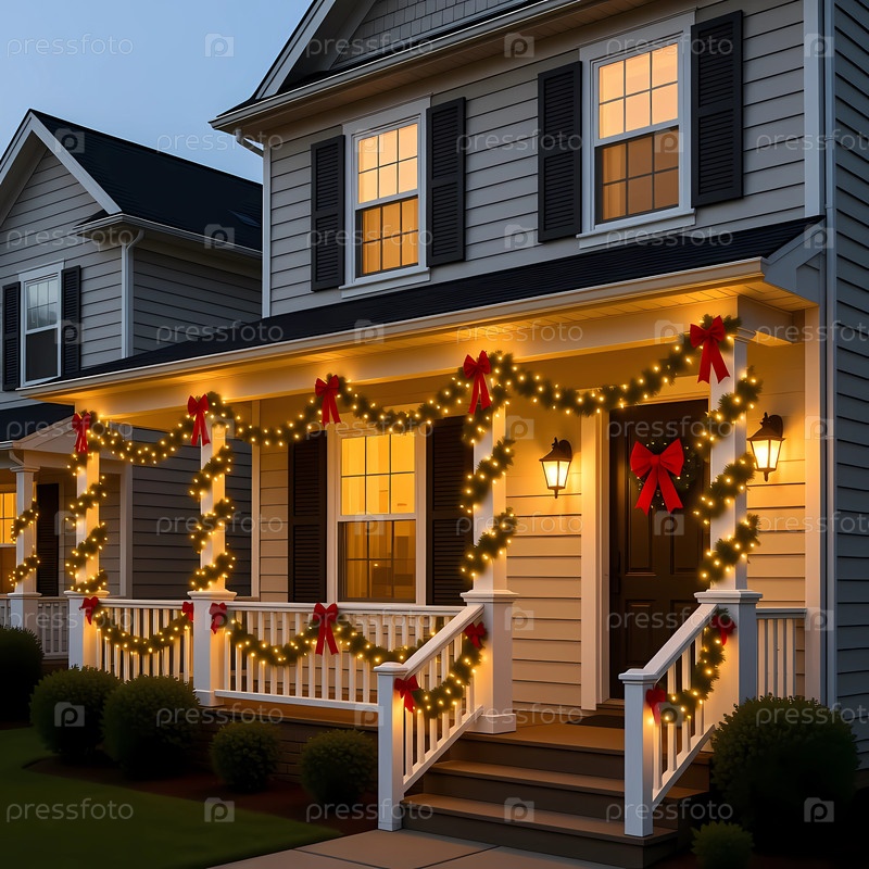 Декорации с рождественскими гирляндами и огнями вешаются вдоль крыльца пригородного дома.Внешняя обстановка праздничная для сезона каникул Генеративный AI