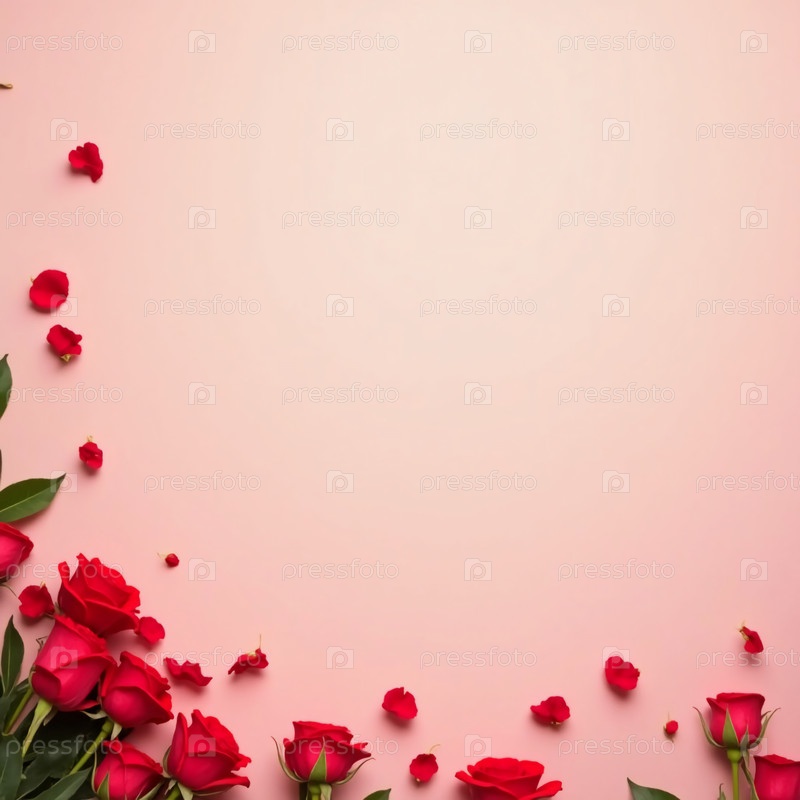 Потрясающая аранжировка красных роз с нежными листьями на мягком розовом фоне, создавая романтическую атмосферу для особых моментов Generative AI