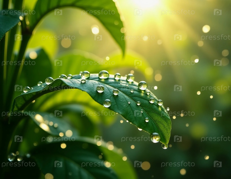Свежие капли росы цепляются за ярко-зеленые листья, захватывая мягкий утренний свет в тихом саду.Природа просыпается с обещанием нового дня Generative AI