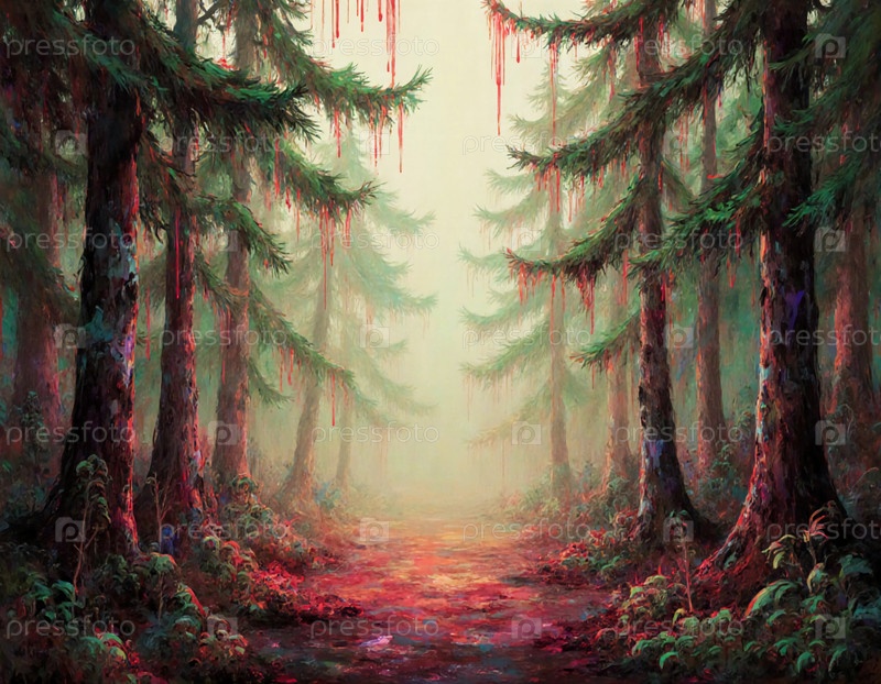 В лесу высокие пихты создают узкий путь под мягким светом.Земля показывает яркие цвета, а туман окружает деревья рано утром Generative AI