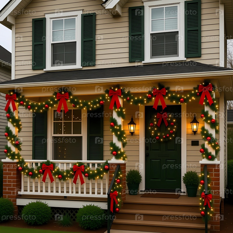 Дом украшают на Рождество гирляндами, красными луками и теплыми огнями.Декорации покрывают крыльцо и выделяют входную дверь, создавая праздничную атмосферу для праздника Generative AI