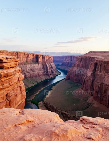 Потрясающий вид с видом на Horseshoe Bend, где река Колорадо грациозно извивается через ярко-красные скальные образования во время захода солнца, создавая волшебную атмосферу