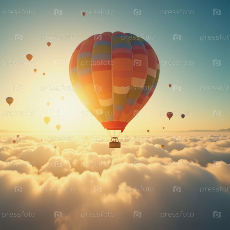 Вибрирующие воздушные шары без усилий плавают среди раскачивающихся облаков, когда солнце начинает восходить, бросая теплый свет на это очаровательное утро Генеративный ИИ