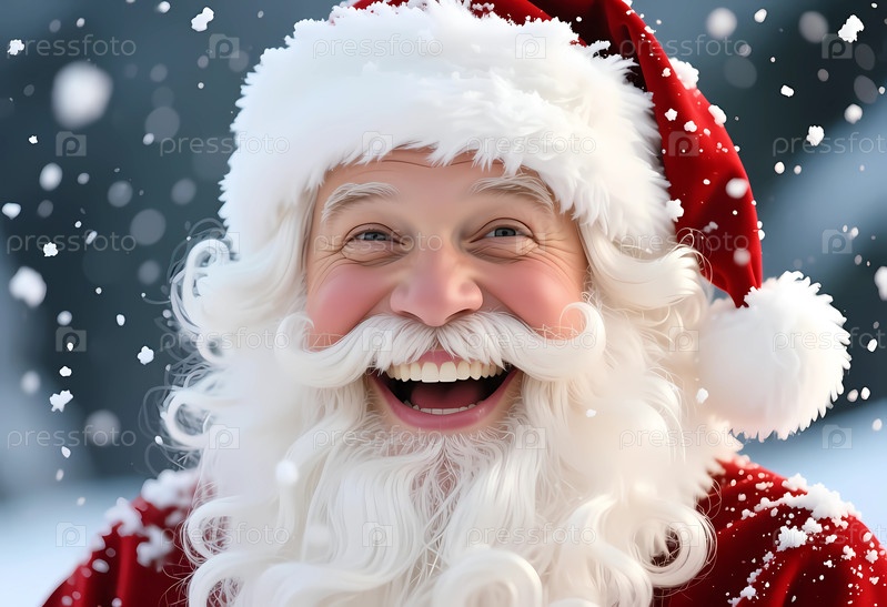 Санта-Клаус показывает большую улыбку с белыми снежинками, падающими вокруг него.Он одет в красный костюм и шляпу, отмечая праздники сезона Generative AI