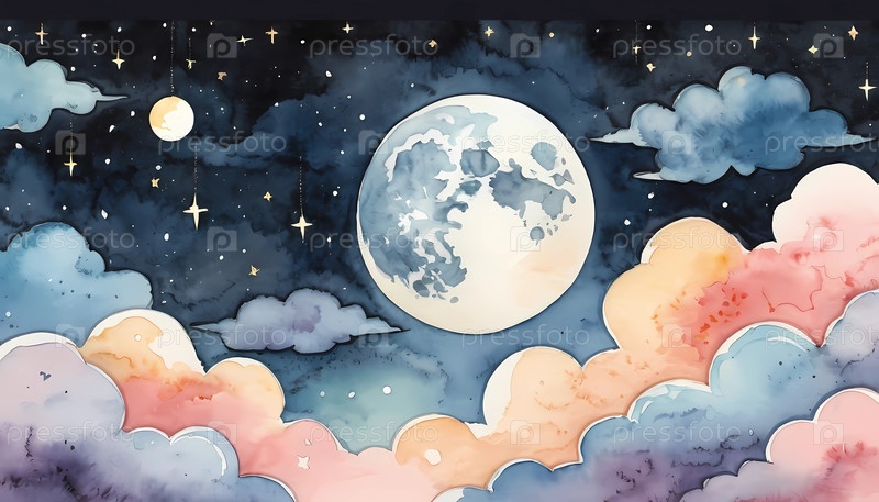 Потрясающая акварель лунного неба с облаками и звездамиидеально подходит для любителей искусства и мечтателей!