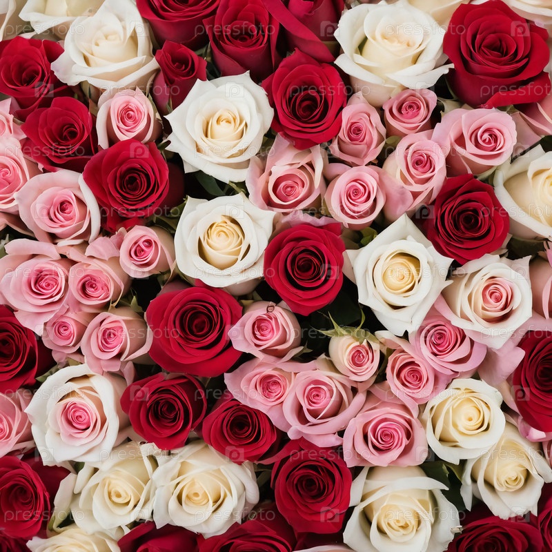 Красивая коллекция красных, розовых и белых роз, расположенных гармонично, идеально подходит для выражения любви и радости во время романтических случаев или весенних мероприятий