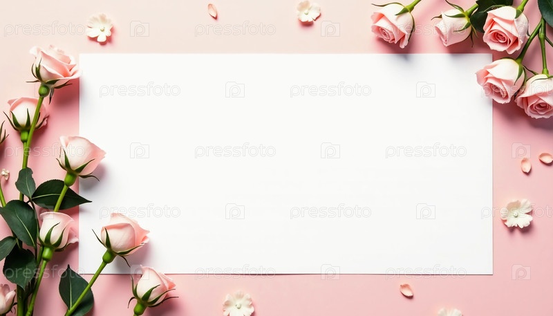 Мягкие розовые розы грациозно обрамляют пустой белый холст, приглашая к творчеству и теплоте, идеально подходят для романтических сообщений или художественного вдохновения на нежном фоне Generative AI