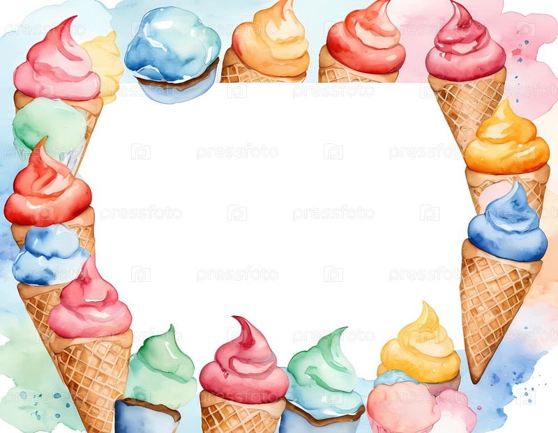 Очаровательные акварельные рисунки включают в себя множество ярких мороженого конусов, обрамленных игривыми пастельными цветами, идеально подходят для праздничных приглашений или меню на летних собраниях