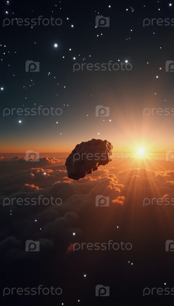 Астероид дрейфует по космосу, освещенный золотыми лучами далекого восхода солнца.Ниже мягкие облака простираются по простору неба, создавая спокойный фон