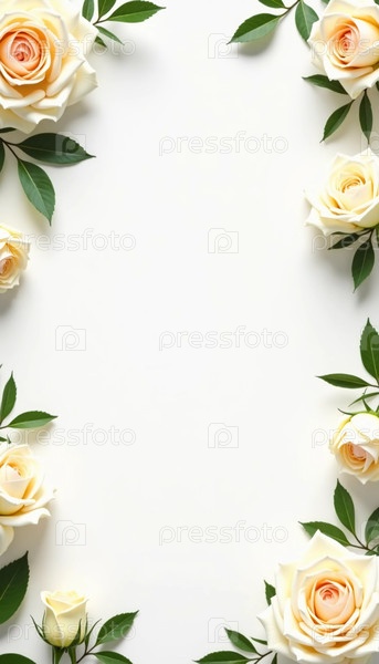 Очаровательная коллекция кремовых роз, окруженных яркими зелеными листьями, создает завораживающую границу, идеальную для приглашений, поздравительных открыток или художественных выставок