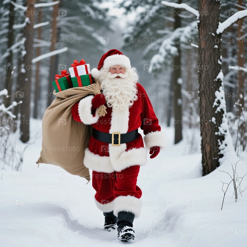 Санта-Клаус гуляет в снежном лесу, держа большой мешок с подарками. Он путешествует по тропе, окруженной высокими деревьями. Это зима со снегом на земле Генеративный AI
