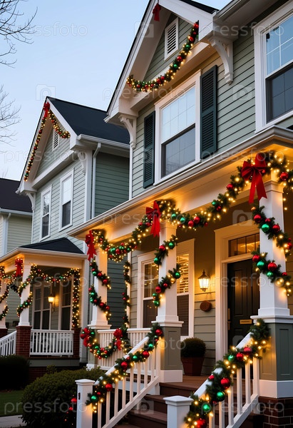 Красочная рождественская гирлянда украшает внешний фасад жилого здания Generative AI