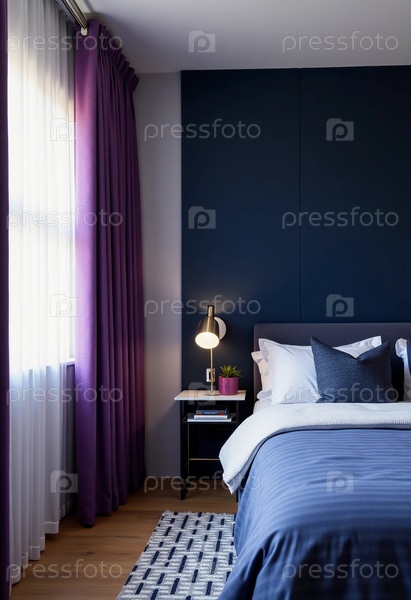 Эта современная спальня имеет темно-синий и фиолетовый цвета, со стильной кроватью, ночным столом и приглашающим естественным светом, проходящим через большое окно, создавая спокойную атмосферу Generative AI