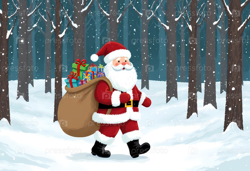 Санта-Клаус идет по снежной тропе в лесу, наполненном деревьями.Он несет большой мешок с подарками для детей и наслаждается зимним днем Generative AI