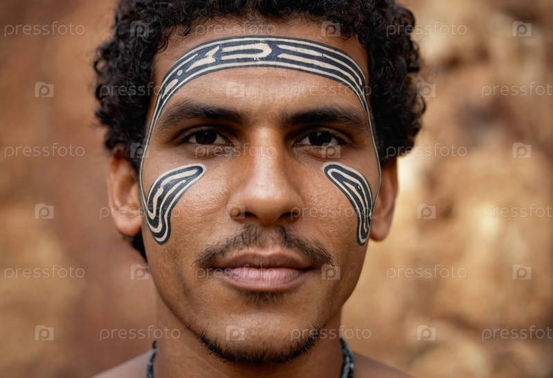 Молодой австралийский абориген уверенно стоит, подчеркивая сложное искусство тела на лице на фоне земных тонов