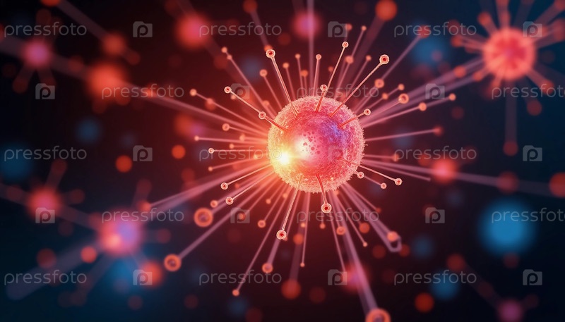 Художественное представление демонстрирует вирус с яркими цветами и сложными структурами, излучающий увлекательное свечение на темном фоне, подчеркивая чудеса микробиологии Генеративный ИИ