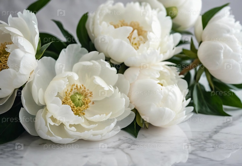 Нежные белые пионы грациозно отдыхают на гладкой мраморной поверхности, их мягкие лепестки разворачиваются среди пышных зеленых листьев, освещенных нежным естественным светом