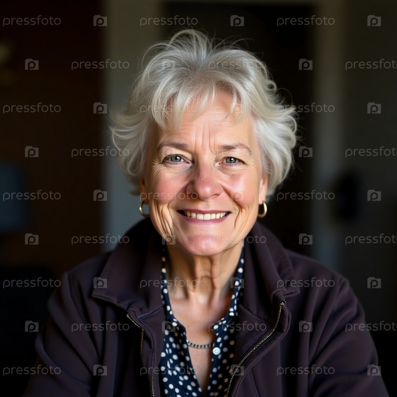 Веселая пожилая женщина с короткими белыми волосами спокойно сидит в комфортном помещении, излучая радость и тепло своей нежной улыбкой