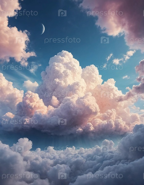 Мягкие хлопка-конфета облака вращаются и танцуют под нежным полумесяцем луны, бросая мирное свечение над тихим лазурным небесом в сумерках