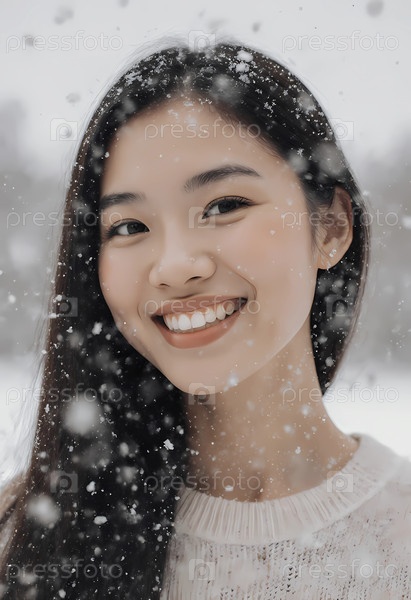 Женщина стоит снаружи в зимний день, улыбаясь, когда вокруг нее падают снежинки.Она находится в заснеженной области с деревьями на заднем плане и выглядит радостной в холодную погоду Generative AI