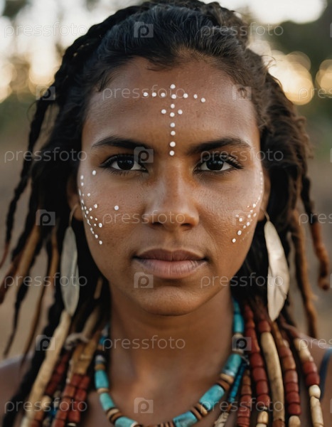 Молодая австралийская аборигенка уверенно стоит, ее поразительные черты подчеркиваются сложной краской на лице и яркими украшениями Generative AI