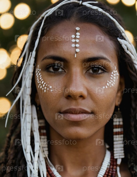 Молодая аборигенская женщина уверенно стоит, отмечая свое культурное наследие сложным искусством тела и традиционными аксессуарами на мягком блестящем фоне Generative AI