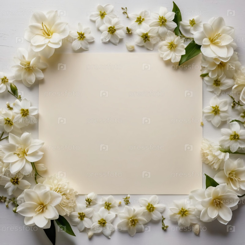 Прекрасное расположение белых цветов окружает пустое полотно. пышные цветки приглашают к творчеству, что делает его идеальным для художественного выражения или персонализированных сообщений