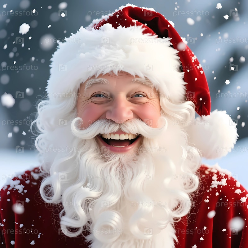 Санта-Клаус улыбается в снежном пейзаже. Он с полной бородой и красным костюмом. Снежинки падают вокруг него. Это веселый момент радости и празднования Generative AI