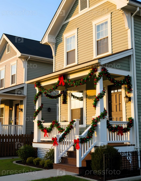 Дом показывает теплый показ рождественских украшений с гирляндами и луками на крыльце