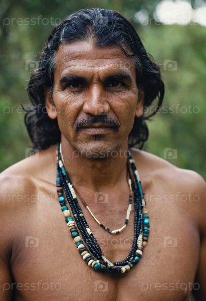 Серьезный австралийский абориген уверенно стоит в зеленом ландшафте, украшенный традиционными ожерельями, празднуя наследие и идентичность в объятиях природы