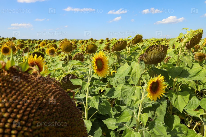 Поле созревающих подсолнухов под летним небом с легкими облаками