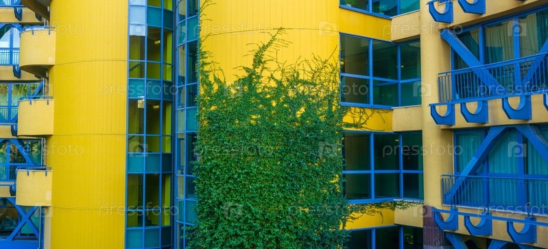 Экстериор современного здания с голубо-желтой стеной и зеленым плюшем