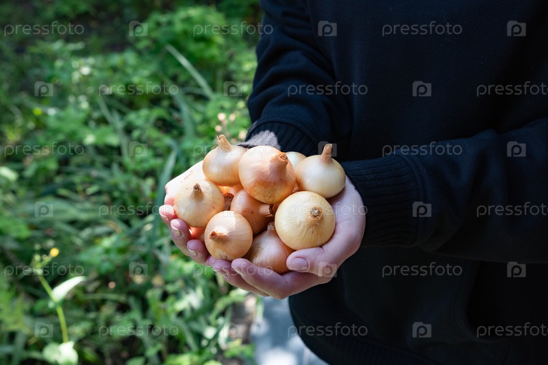Руки мягко обнимают коллекцию маленьких круглых луков на фоне пышной зеленой листьев при ярком дневном свете, демонстрируя естественную красоту урожая