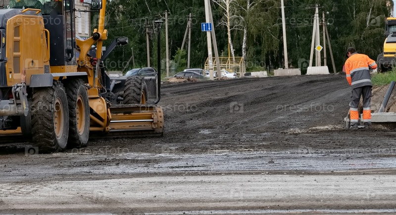 Строительная техника работает на дороге на рабочей площадке в городской зоне в дневное время